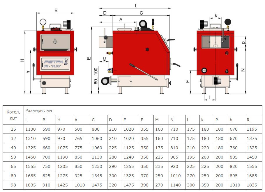 Технічні характеристики котлів модельного ряду "Ретра-3М" потужністю 25-98 кВт