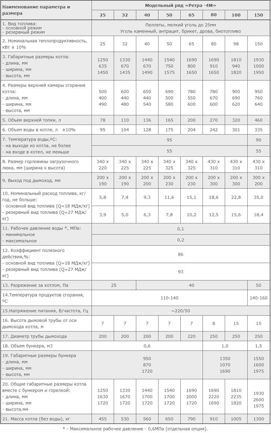 Технічні характеристики котел модельного ряду "Ретра-4М" потужністю 25-150 кВт