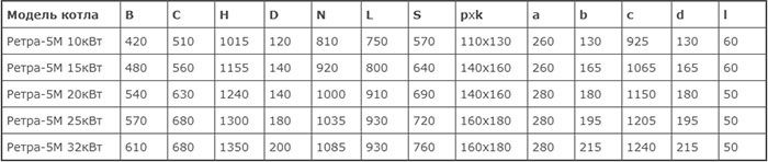Технічні характеристики котлів модельного ряду "Ретра-5М" потужністю 10-32 кВт