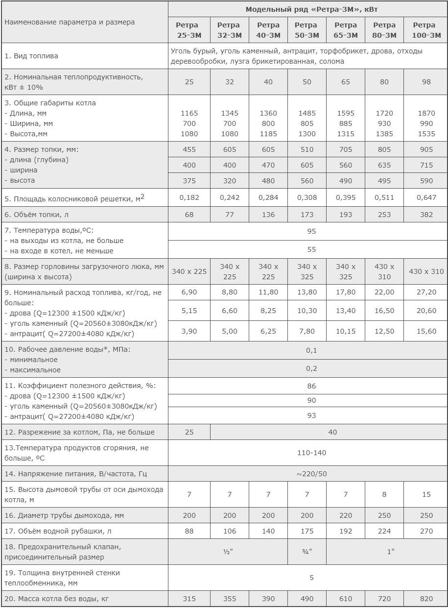 Технічні характеристики котлів модельного ряду "Ретра-3М" потужністю 25-98 кВт