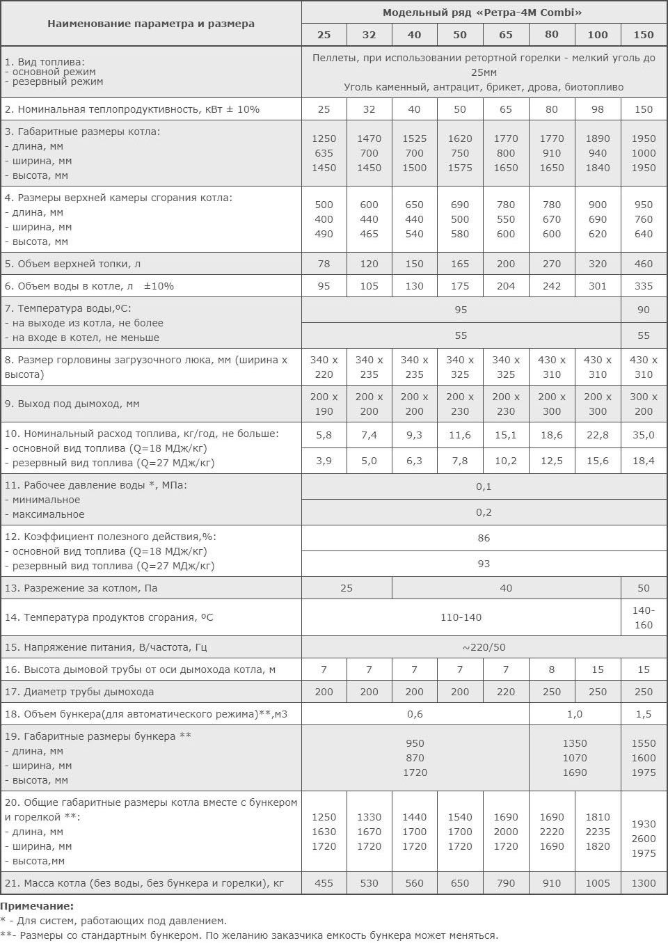 Технічні характеристики котлів «Ретра-4М Combi» потужністю 25-150 кВт