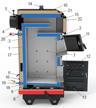 Сталевий теплообмінник (1) складається з двох частин, у нижній частині міститься камера згоряння (2), у верхній розташовані прямі горизонтальні перегородки (3) (конвекторні камери), які утворюють конвективні канали теплообмінника. Прямі горизонтальні перегородки та стінки теплообмінника охолоджуються водою, утворюючи так звану «водяну сорочку». Процес горіння відбувається в камері згоряння на водоохолоджуваних колосникових решітках (22), під колосниковими решітками міститься камера піддувала (зольник) (11). Димові гази пройшовши конвективні канали теплообмінника потрапляють у димохід (4).
