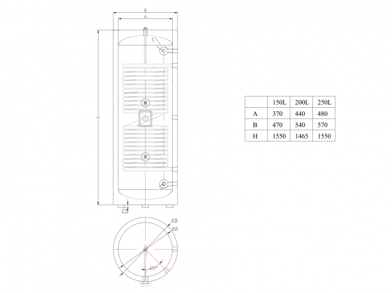 - Ефективний теплообмінний змійовик: 30-метровий змійовик усередині бойлера сприяє ефективній теплопередачі, забезпечуючи швидке нагрівання та постійну подачу гарячої води. Квадратура серпантину 4,50квадратних метра! Що ідеально для теплових насосів повітря вода невеликої потужності.